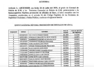 Era la noticia más esperada de los últimos meses en la Policía. El Consejo de Generales y la ministra de Gobierno, María Paula Romo, acaban de expedir el acuerdo 0398, que resuelve ascender a 43 tenientes coroneles de la promoción 57 al inmediato grado superior.