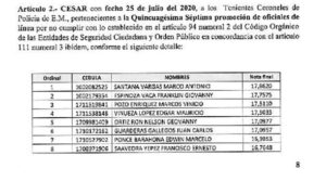 No fueron promovidos, al no alcanzar la nota necesaria, diez oficiales, entre quienes están los tenientes coroneles Francisco Saavedra, que obtuvo una nota promedio de 16.7648, y Juan Guarderas, con 17.0957.