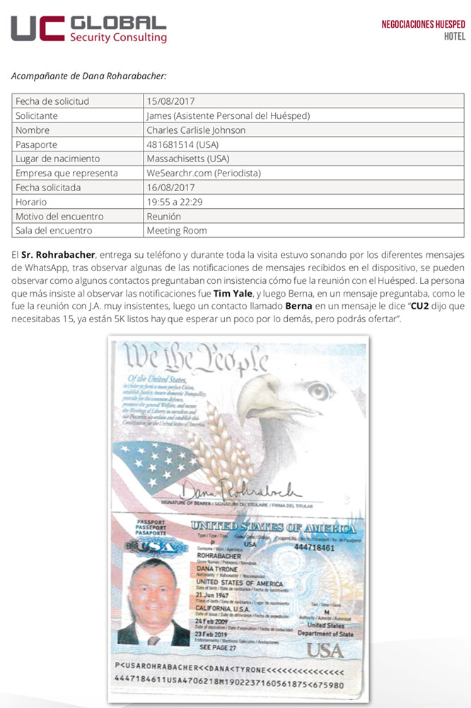 El reporte de 8 páginas destaca que Rohrabacher llegó a la embajada el 16 de agosto de 2017 junto al periodista Charles Carlisle Johnson, propietario de los sitios web, GotNews.com y WeSearchr. com, quien se describe como un troll de Internet, conocido por difundir informaciones escandalosas sin fundamento. Ambos entraron a la sede diplomática a las 19:55 y salieron a las 22:29.