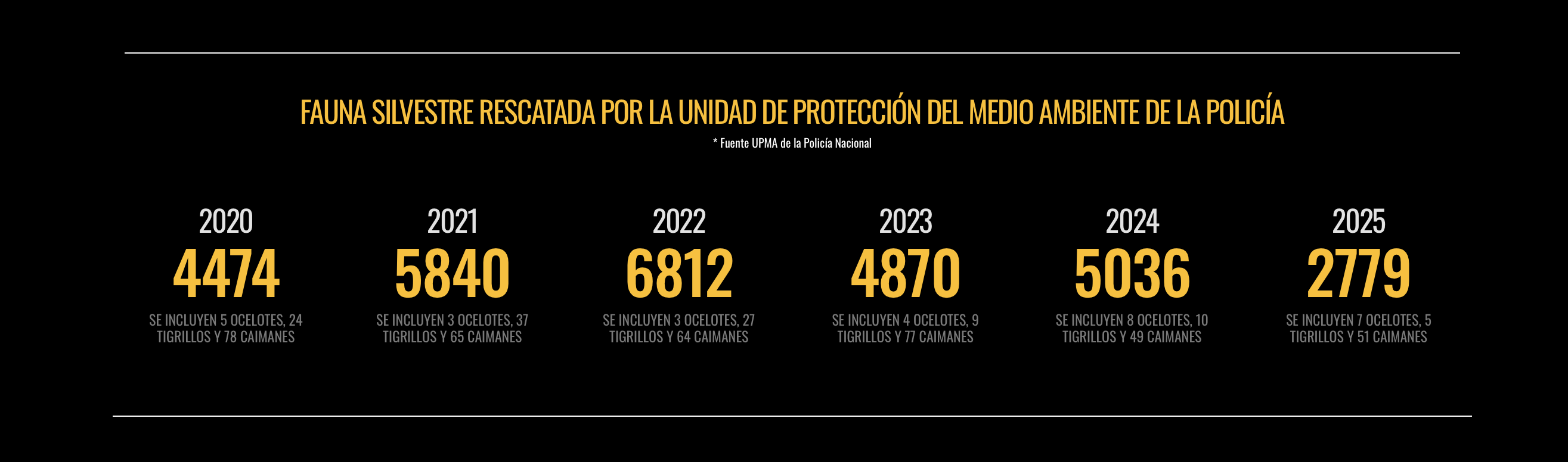 Entre 2023 y mediados de 2025, 14 ejemplares de animales nativos y exóticos fueron incautados en operativos y allanamientos a las estructuras criminales, según el Ministerio de Ambiente, Agua y Transición Ecológica (MAATE), en respuesta a un pedido de información de este proyecto. Varias de las especies decomisadas se encuentra en peligro de extinción y hacen parte de la Lista Roja de Especies nacionales e internacionales de la Unión Internacional para la Conservación de la Naturaleza (UICN), según ese ministerio. Varios están protegidos por la Convención sobre el Comercio Internacional de Especies Amenazadas de Fauna y Flora Silvestres, CITES.