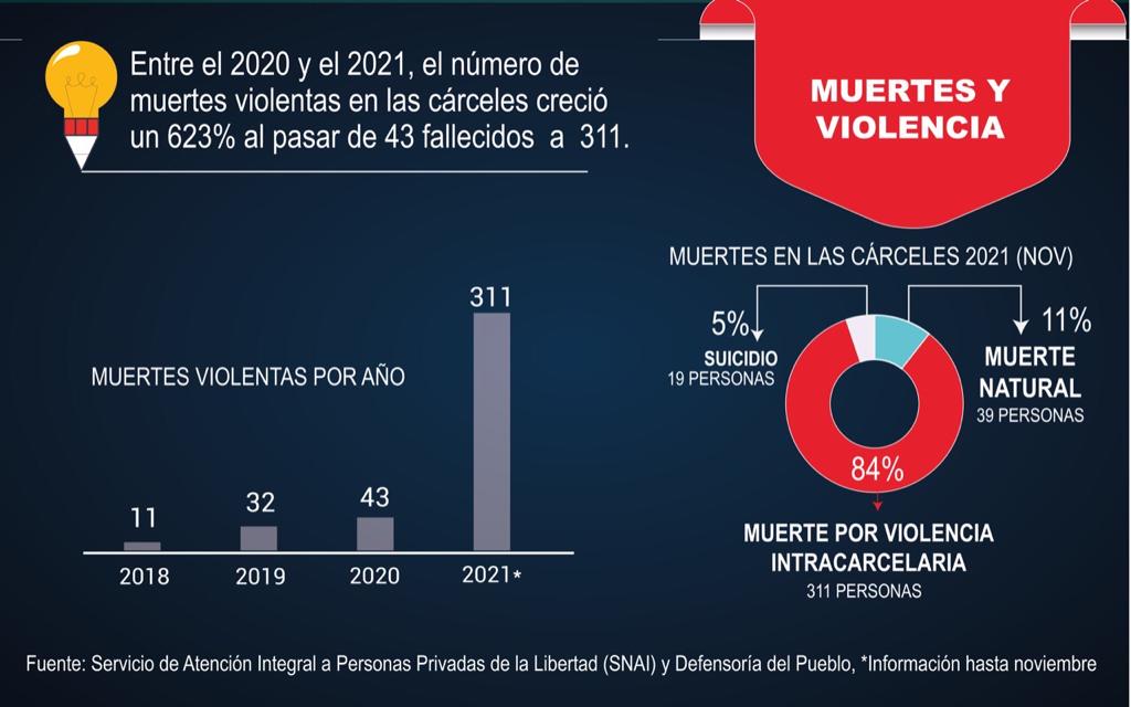 Para esta investigación hicimos pedidos de información y accedimos a informes del Ministerio de Salud, Servicio de Atención de Personas Privadas de la Libertad (SNAI), el Consejo de la Judicatura, la Defensoría Pública, la Defensoría del Pueblo, Ministerio de Gobierno y organismos de Derechos Humanos. Con toda esa información levantamos nuestras propias bases de datos, que dimensionan la magnitud de la crisis carcelaria y sus causas.
