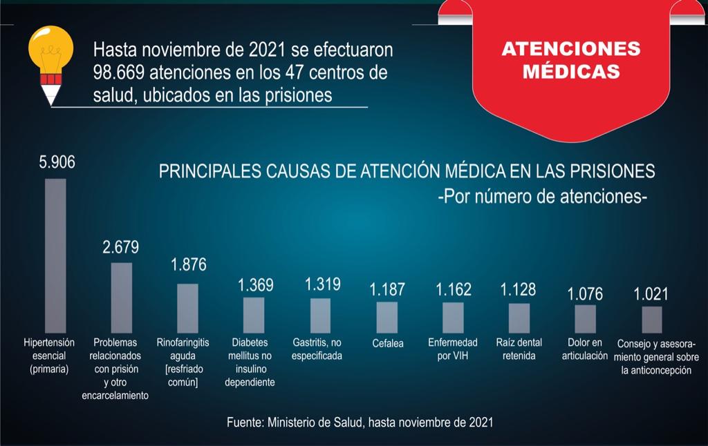 En los presidios hay servicios de medicina general, enfermería, psicología, odontología y obstetricia de forma permanente y/o itinerante. Las atenciones adicionales son gestionadas, esporádicamente, a través de interconsultas y referencias hacia establecimientos de mayor capacidad resolutiva, en los casos de mayor gravedad, pero toman tiempo y son excepcionales.