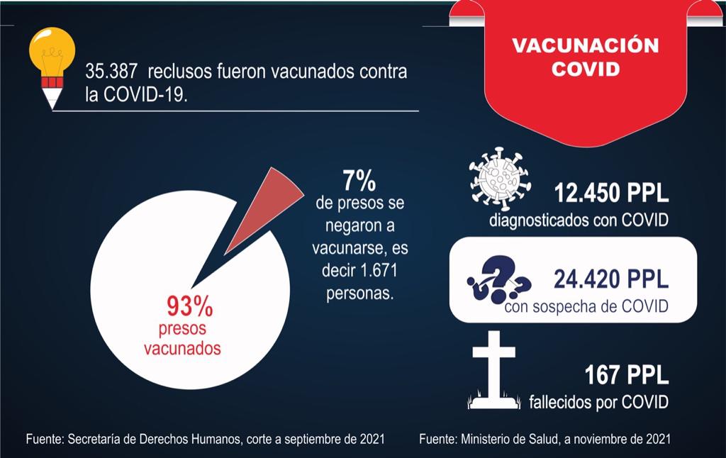 Otra situación que complicó el panorama fue la pandemia. Hasta diciembre del 2021, 2.450 presos se han contagiado con Covid-19, que representa un 40% de todos los internos. En dos años fallecieron por esa enfermedad 167 internos y actualmente el 93% de los presos está vacunado, lo cual ha controlado los contagios, impidiendo nuevos brotes.