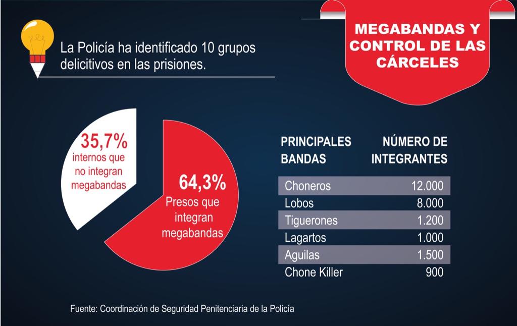 De los 36.599 presos, 25.000 son parte de diez organizaciones delictivas identificadas por la Policía en las prisiones. Los principales son Los Choneros (12.000 miembros) y Los Lobos (8.000), según un informe de la Coordinación de Seguridad Penitenciaria de la Policía.