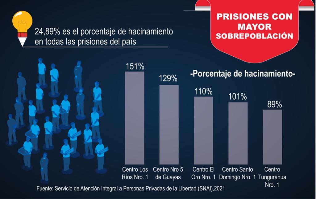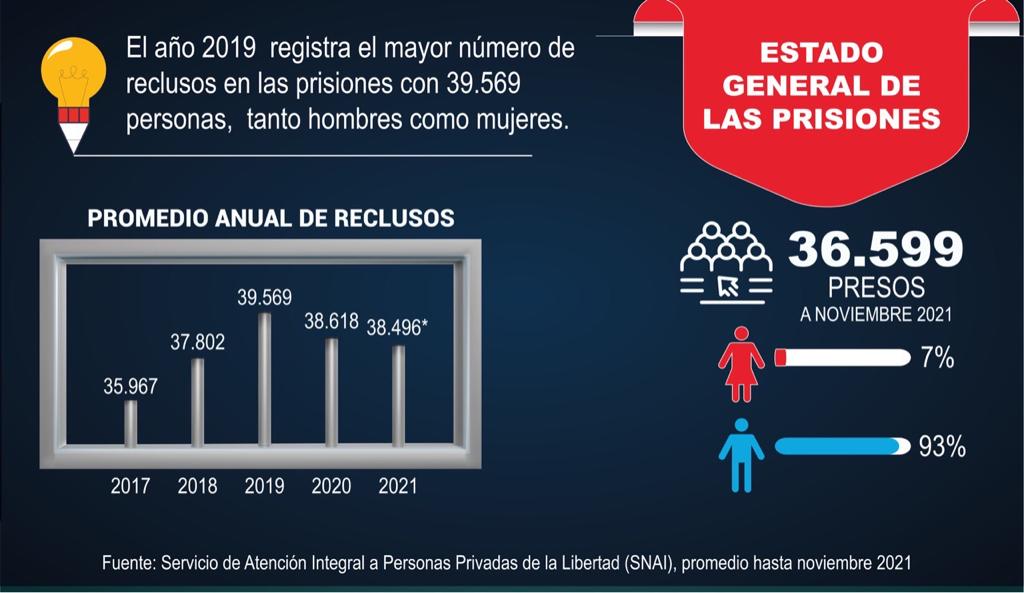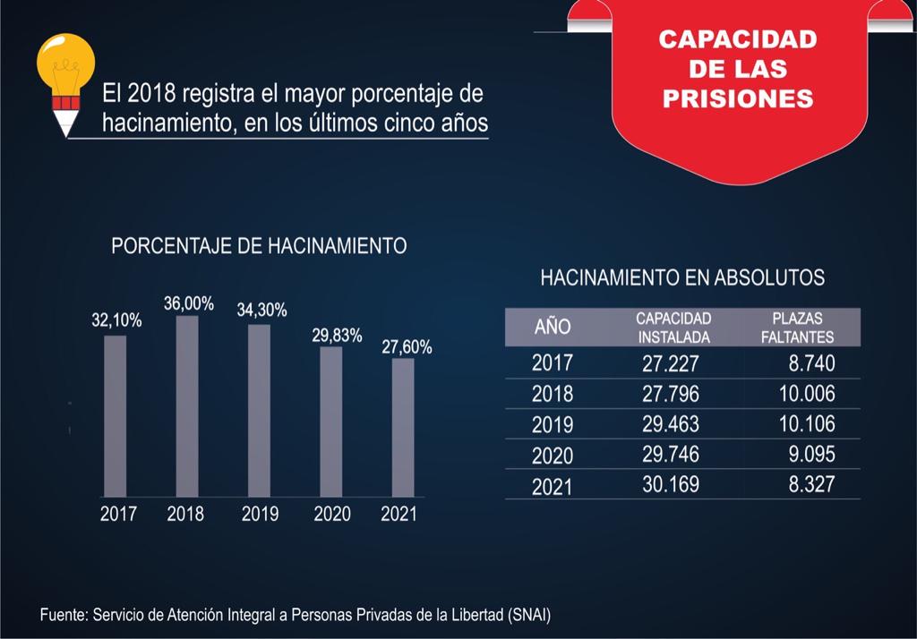 La sobrepoblación complica el control por la insuficiencia de agentes penitenciarios que siempre serán insuficientes. Hay 1.550 guías para una población que a noviembre del 2021 se ubicaba en 36.599 presos. Se requieren 5.000 agentes.
