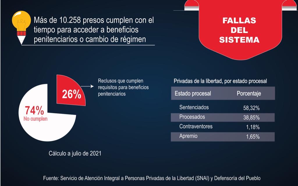 Solo el 58,39% de los reclusos tiene sentencia; el 38,77% están procesados, es decir mantienen la presunción de inocencia. El 2,8% se divide entre contraventores y apremio, según informes del Servicio Nacional de Atención Integral a Personas Adultas Privadas de la Libertad y a Adolescentes Infractores (SNAI).