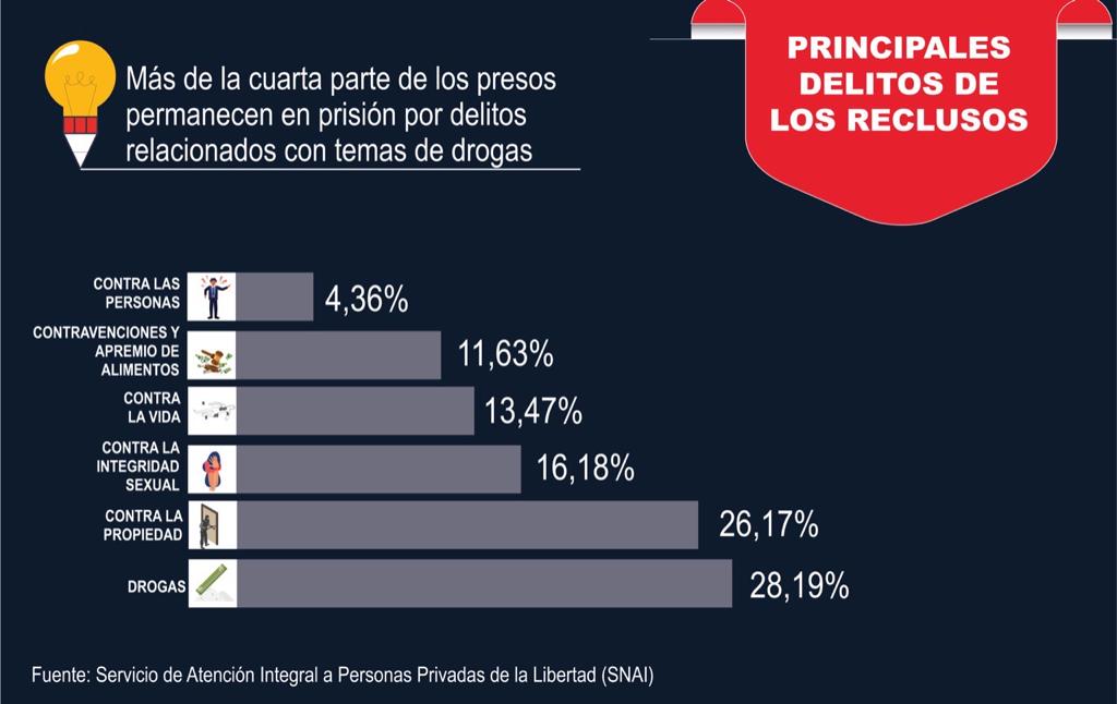 La criminalización por delitos de drogas llenó las prisiones de pequeños consumidores, que no reciben ningún tratamiento para sus adicciones. El 28,18% de los detenidos cometieron delitos de drogas. Es decir, 3 de cada 10 internos están encarcelados por esta razón. Son el grupo mayoritario del sistema.