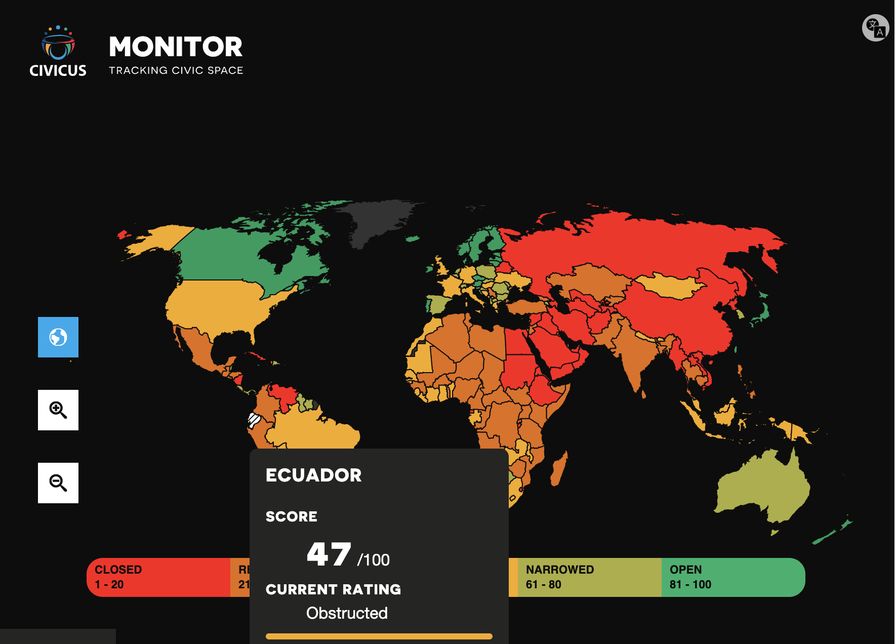 ⇒La calificación del espacio cívico de Ecuador como obstruido se asigna a países diferentes sectores sociales y están fuertemente atacados por quienes detentan el poder, quienes imponen una combinación de imposiciones legales y prácticas que limitan el pleno ejercicio de los derechos fundamentales. 39 países en el mundo se ubican en esta calificación.
