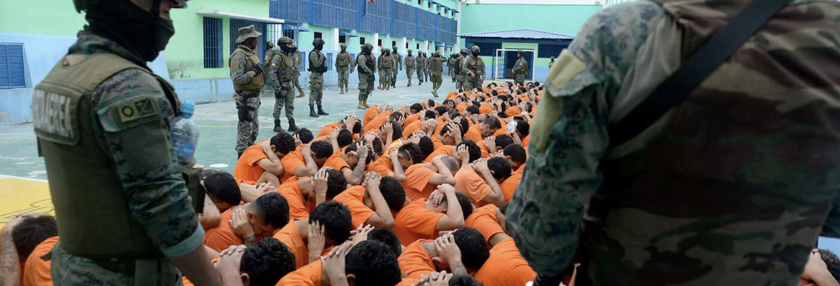 Militares y reclusos en el Centro de Detención de Manabí, Ecuador, conocido como la cárcel El Rodeo, en Portoviejo, Manabí, el 5 de junio de 2024. Fotografía de Gerardo Menoscal/AFP vía Getty Images. Tomada del informe de INVICTUS