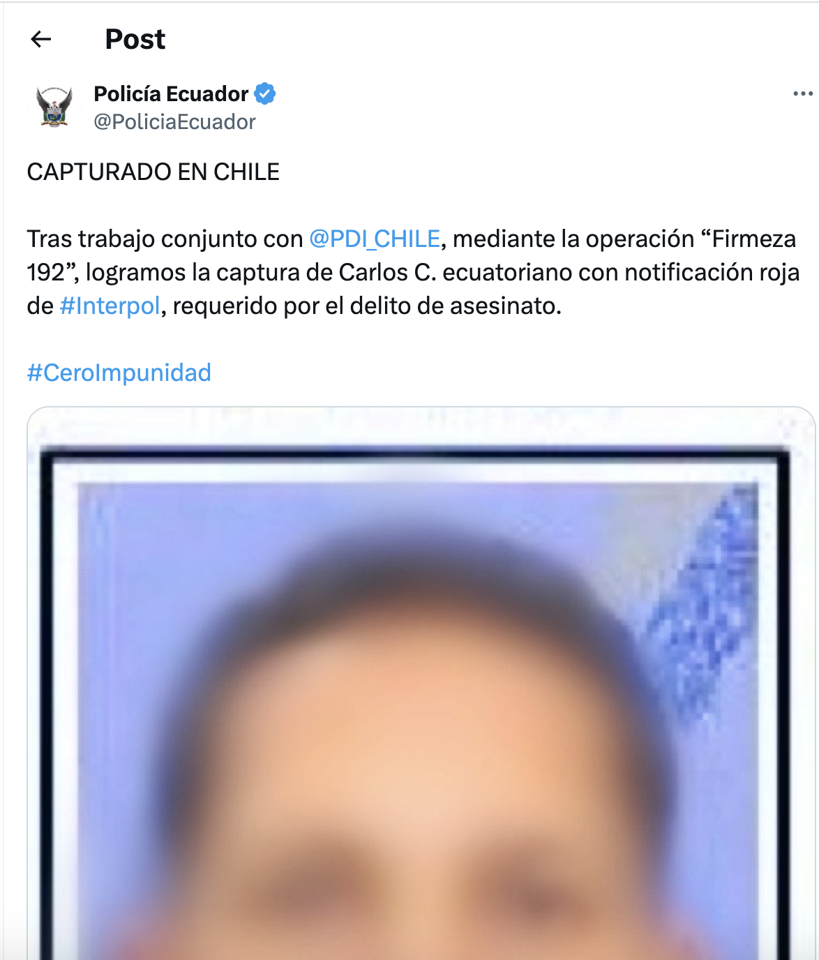 Ese procedimiento fue detallado por el comisario de la Interpol Chile, Ricardo Micaly. “Gracias al análisis criminal de un equipo multidisciplinario de Interpol Santiago, en conjunto con la Policía de Quito y nuestro Laboratorio de Criminalística, obtuvimos las impresiones dactilares de quién era requerido por Ecuador”.