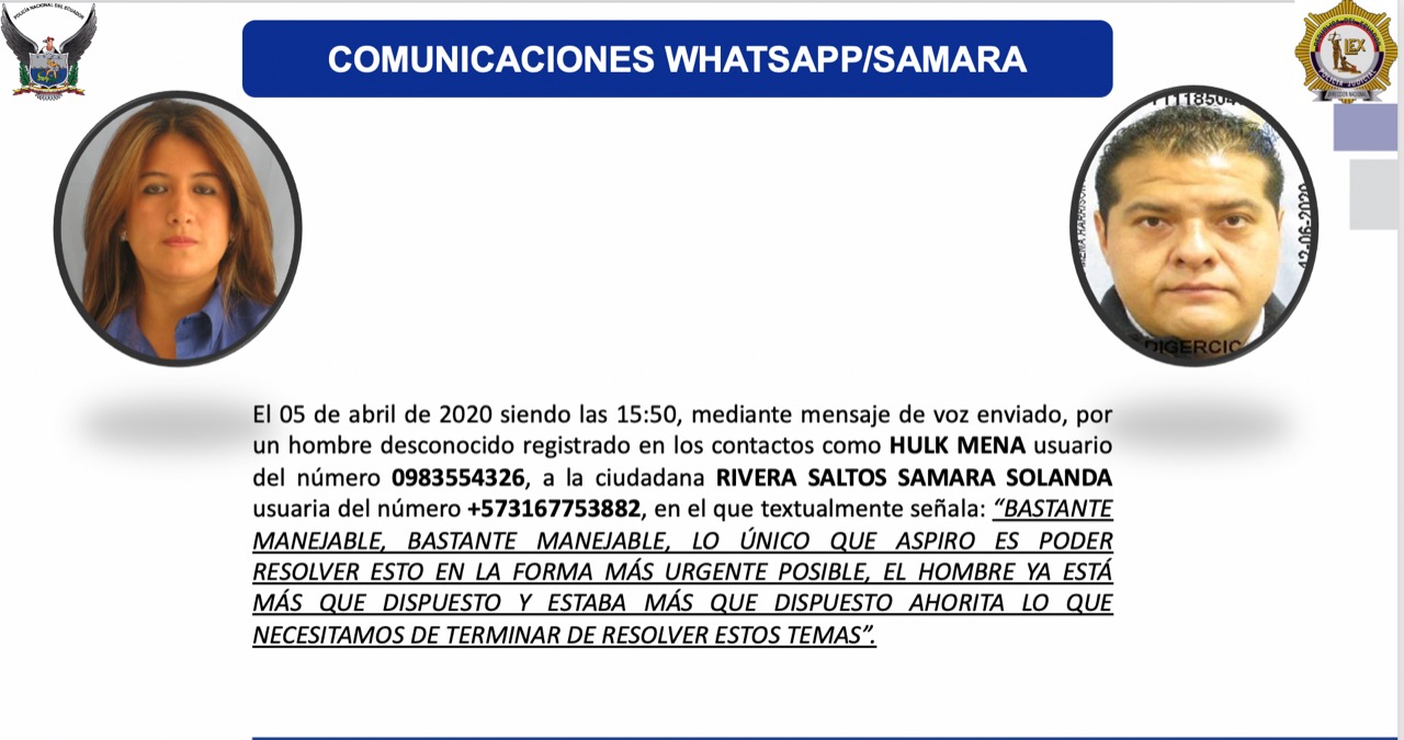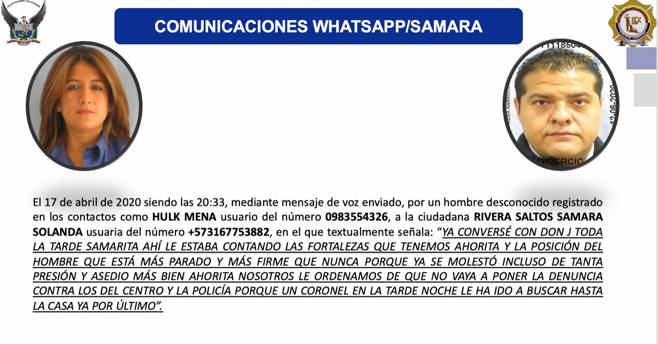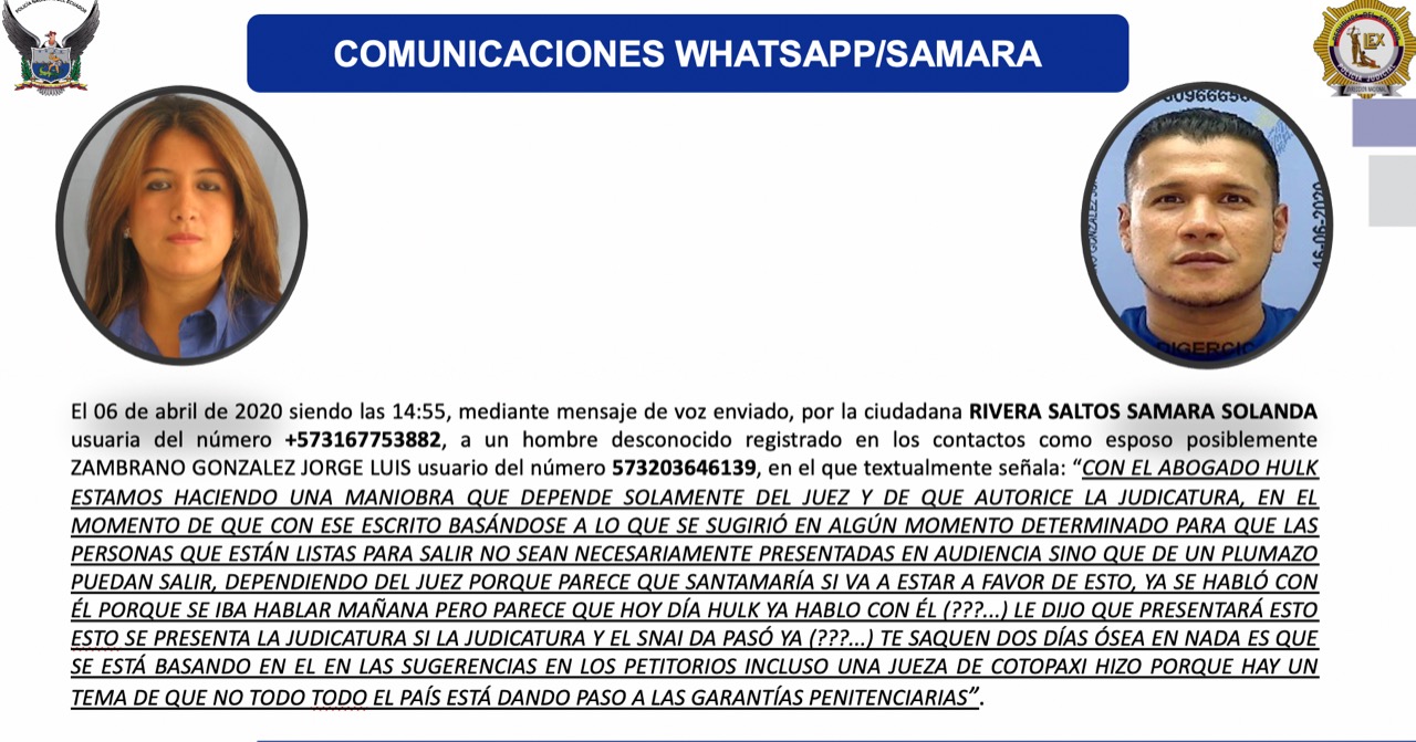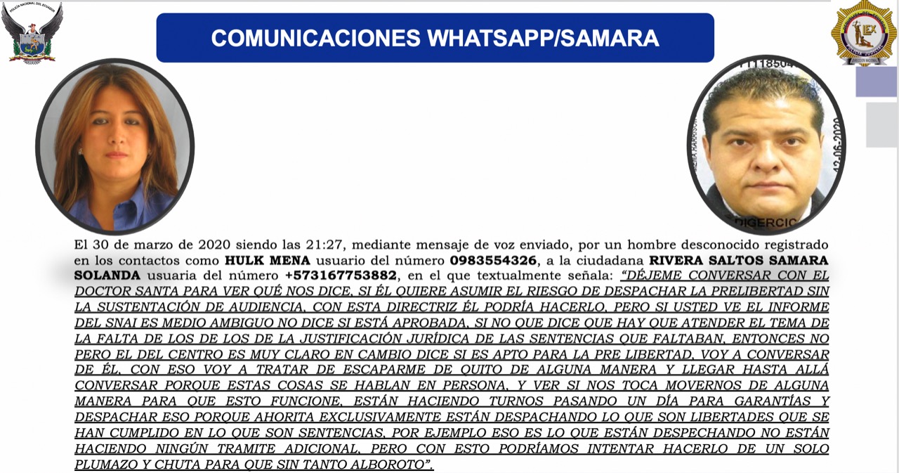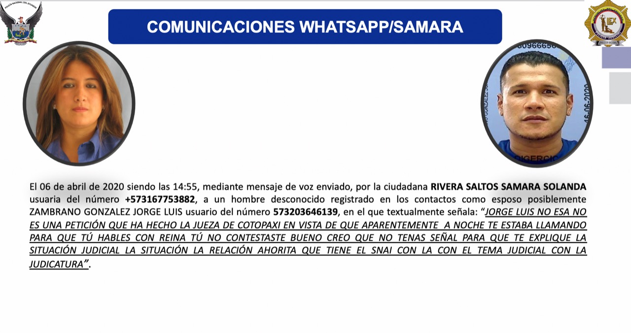 “Rasquiña” no quería dejar un solo cabo suelto para recuperar su libertad. Su pareja, Samara Rivera se convirtió en una intermediaria, un puente para facilitar su excarcelación. Ella, que está recluida en la prisión de Latacunga, mantenía contactos telefónicos constantes con Jorge Luis Zambrano, Rasquiña, su abogado Harrison Salcedo y con funcionarios judiciales y de la Secretaría Nacional de Atención Integral de las Personas Privadas de la Libertad (SNAI).