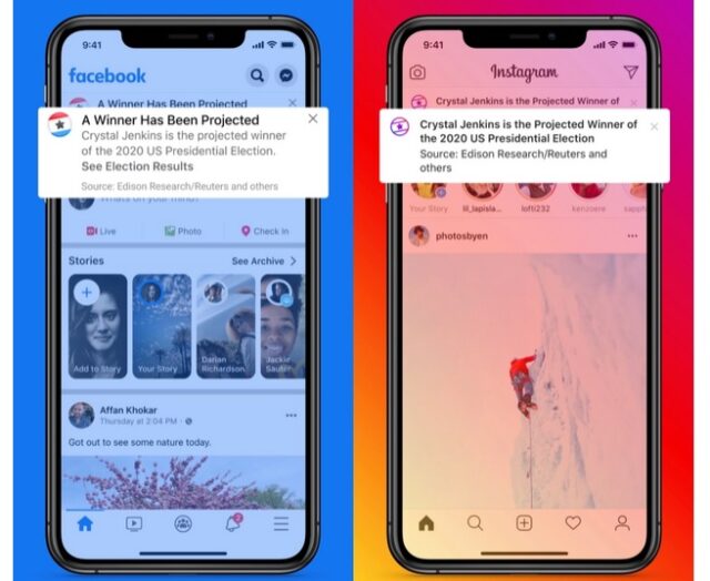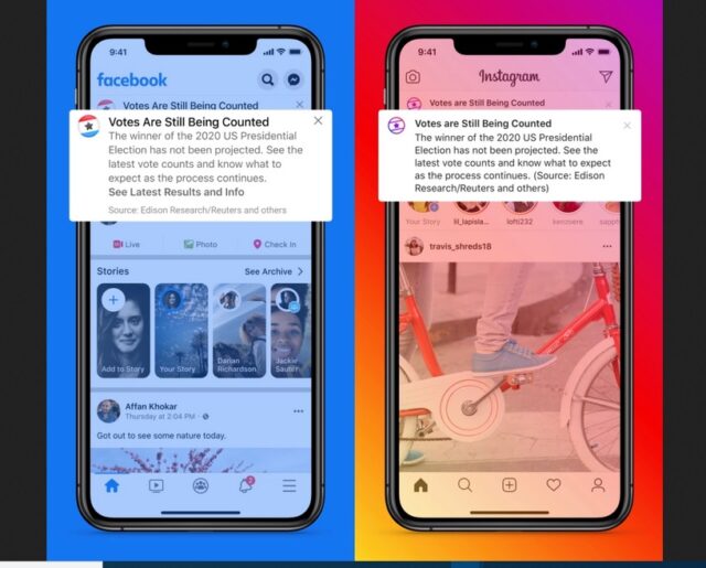 “Añadimos notificaciones en Facebook e Instagram para indicar que el escrutinio de votos está en marcha y que aún no ha ganado”, puntualizó la red social.