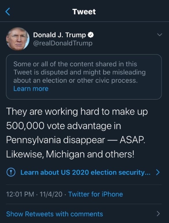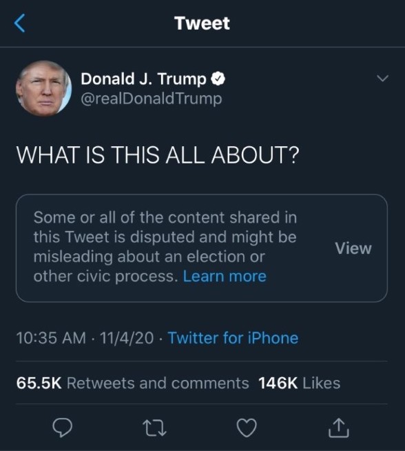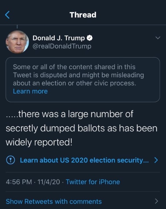 Bajo estas condiciones, Twitter etiquetó diez mensajes que envió Trump luego de conocer los resultados que no favorecían a su campaña. Al etiquetar estos mensajes su difusión es minimizada, aunque las personas que siguen la cuenta aún pueden ver los mensajes.
